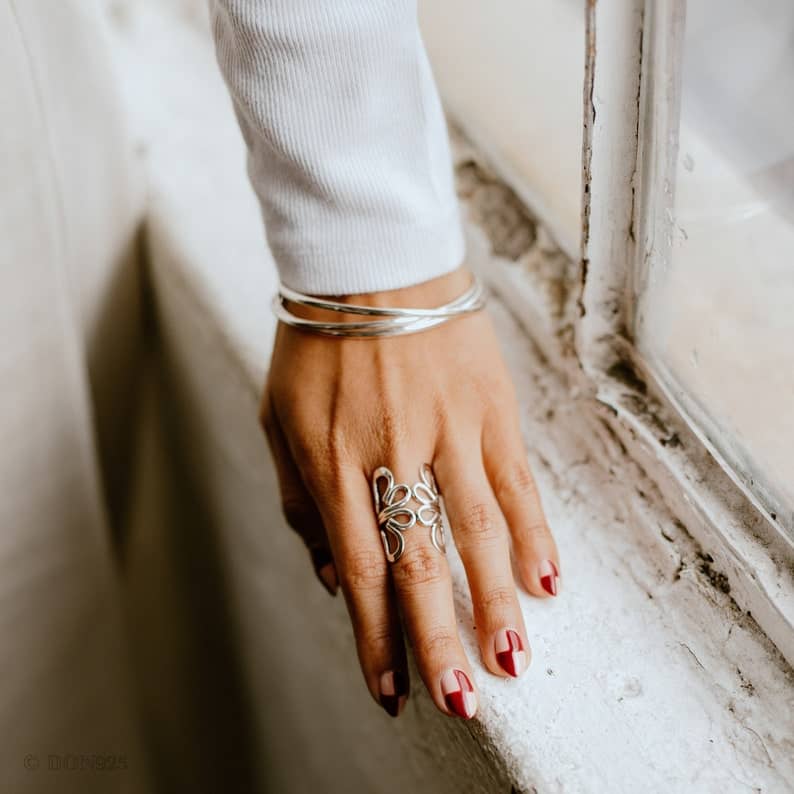 انگشتر نقره زنانه با طراحی گلهای باز و زیبا سرمایه هنری ساخت دست هنرمندان داخلی تولید داخل ساخته شده از نقره اصل باکیفیت بالا مناسب برای استفاده روزمره و مهمانیها قابل ست شدن با انواع استایلهای زنانه بسیار پرجلوه زیبا و چشم نواز.